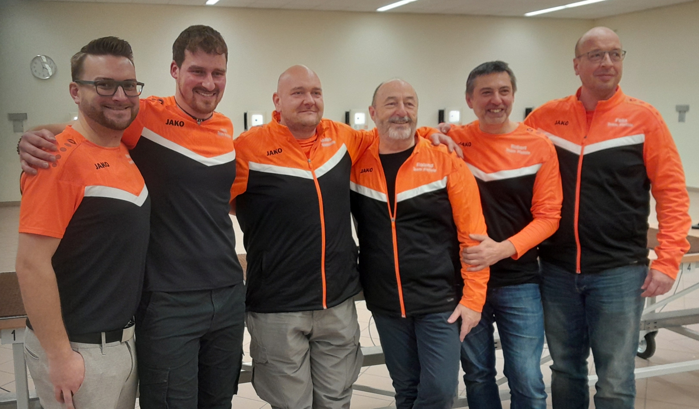 Die Mannschaft Luftpistole Schwabenliga in der Besetzung (von links) Marius Hanenberg, Nico Edenhofner, Matthias Kamitz, Roland Ermark, Robert Lechner und Felix Bletzinger. Weiter haben hier noch mitgeschossen: Werner Schön, Friedrich Beck und Franz Müller.