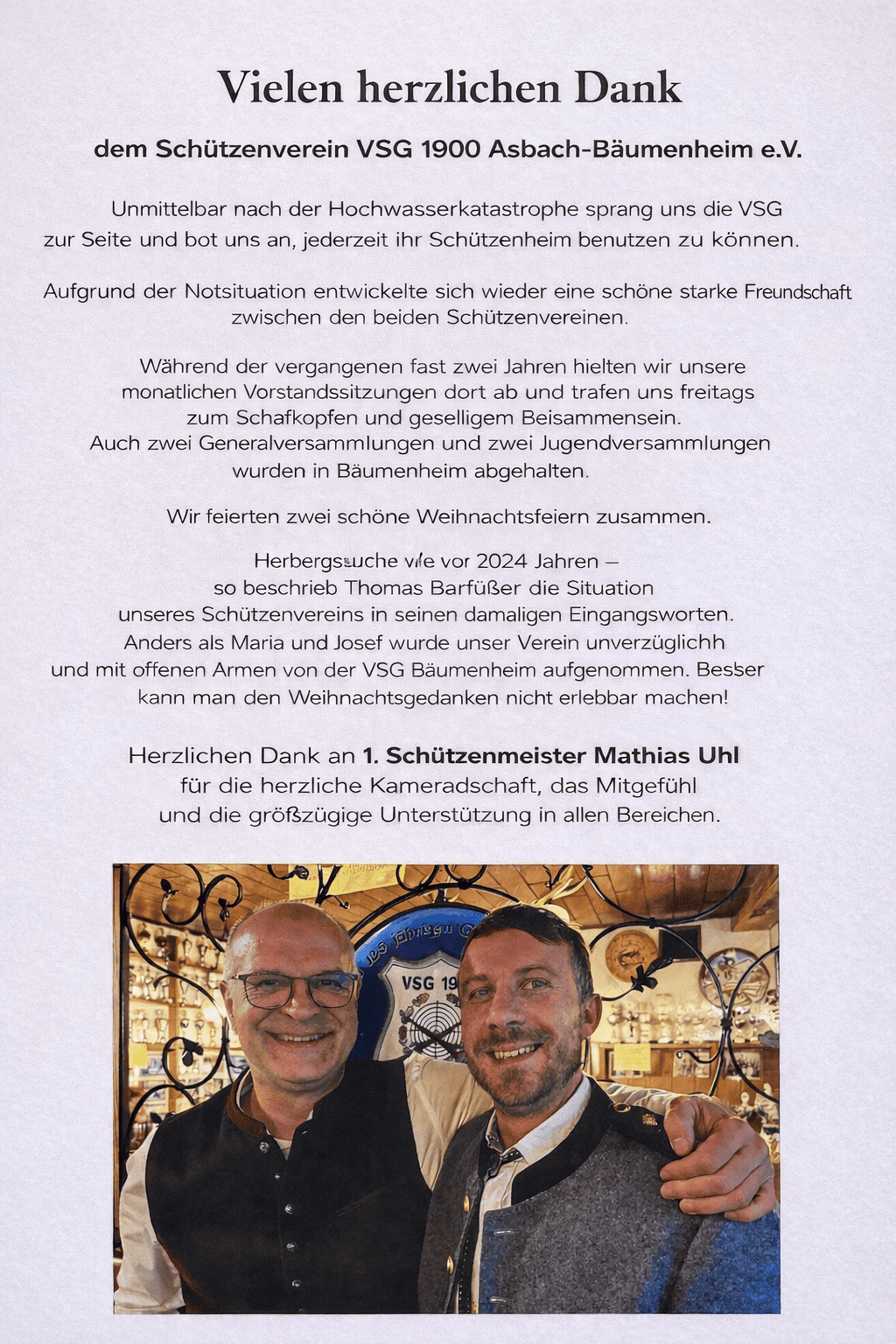 Nach den schweren Hochwasserschäden im Jahr 2024 ist es besonders erfreulich zu sehen, mit wie viel Einsatz, Zusammenhalt und Engagement das Schützenheim wieder aufgebaut wurde. Das Ergebnis kann sich mehr als sehen lassen. Die Räumlichkeiten präsentieren sich heute hell, modern und äußerst gelungen.